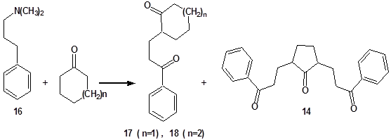 Сам трикетон 14 получается в качестве побочного продукта (7 %) в реакции основания Манниха 16 с циклопентаноном при нагревании до 155 °С (схема 2, путь (а)). Основным продуктом реакции является 1,5-дикетон 17 (n=1). При проведении реакции при микроволновом облучении выход 14 увеличивается до 17 %. А в реакции основания Манниха 16 с циклогексаноном (термические условия, микроволновое облучение) образуется только 1,5-дикетон 18. Образование трикетона в этой реакции не наблюдается.