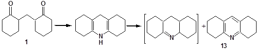 Тиличенко и сотрудники [27], изучая реакцию метиленбисциклогексанона с уксуснокислым аммонием, предположили первоначальное образование декагидроакридина, который диспропорционируется, образуя октагидроакридин и додекагидроакридин: