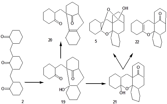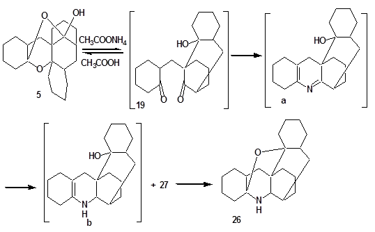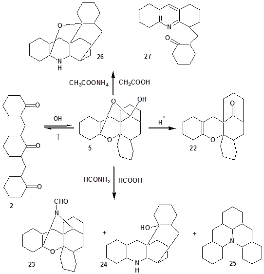 5. 20,21-Диоксагексацикло[10.8.2.01,6.08,19.08,22.014,19]-докозан-22-ол (5), продукт его дегидратации и соответствующий 1,5,9-трикетон в реакции Чичибабина образуют два азотсодержащих гетероциклических соединения, структура которых установлена.