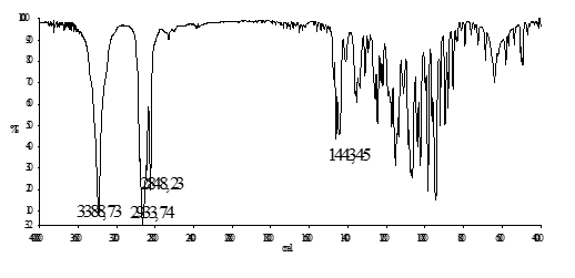 ИК спектр соединения 5 содержит полосу поглощения гидроксильной группы в области 3388.73 см-1 (рис. 2). Полоса поглощения карбонильной группы отсутствует.Рис. 2. ИК спектр соединения 5 в КВr.