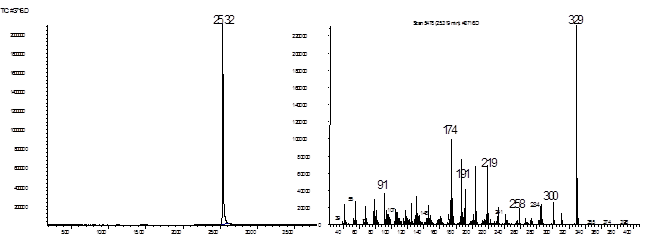 Данные ГЖХ-МС: в.у.25.32; m/z(Iотн.,%): 329 (100) [М]+, 300 (11,5), 219 (32), 204 (33), 191 (19), 174 (50), 91 (19), 55 (15). Вычислено М 329.