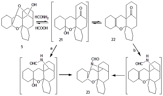 Реакция проводилась при 160-175 °С в формамиде с 85-%-ной муравьиной кислотой. Мы учитывали, что в растворе при нагревании соединение 5 может существовать в виде смеси промежуточных продуктов циклизации (схема 5), содержащих карбонильные группы, а потому можно было ожидать образования разнообразных соединений.