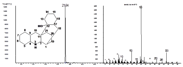 Данные ГЖХ-МС: в.у.13.59; m/z(Iотн.,%): 301 (45) [М]+, 191 (100), 258 (51). М 301, C20H31NO.