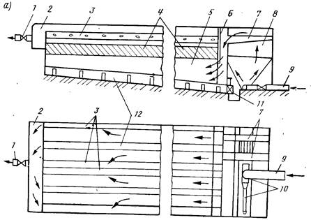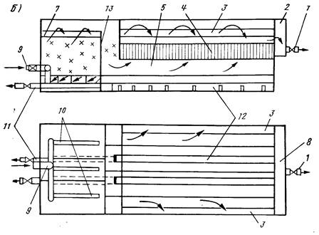 Рис. 6.1. Камеры хлопьеобразования вихревого (а) и зашламленного (б) типа, встроенные в горизонтальный отстойник.