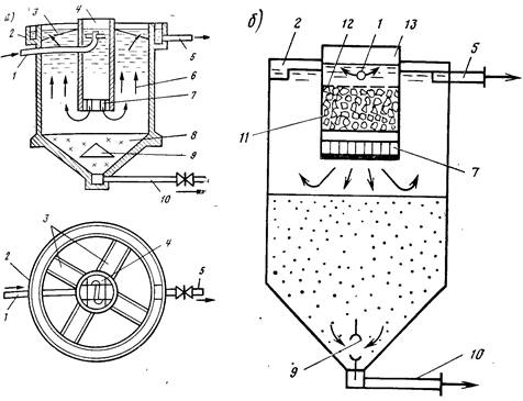 Рис. 6.2. Водоворотная (а) и контактная (б) камеры хлопьеобразования, встроенные в вертикальный отстойник.