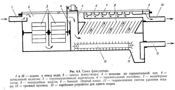 Флокуляторы устраивают с мешалками на вертикальной или горизонтальной оси. В первом случае их обычно оборудуют моторами с переменной скоростью вращения, во втором — один двигатель обслуживает несколько мешалок. Мешалки располагают в начале коридора отстойники в два ряда и более и разделяют перегородками для циркуляции воды. Флокуляторы выполняют различной формы в плане: квадратными, круглыми и прямоугольными. Оптимально применение пропеллерных мешалок, создающих аксиальные потоки, что ослабляет процесс разрушения образовавшихся хлопьев.