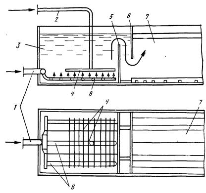 1 и 2 — подача исходной воды н воздуха; 3 — камера аэрофлокулятора; 4 и 8 — воздухо- и водораспределительная система; 5 — затопленный водослив; 6 — струенаправляющая перегородка; 7 — горизонтальный отстойник