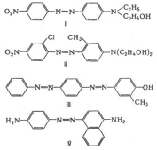 По химическому строению дисперсные красители – главным образом, азокрасители и антрахиноновые красители, реже – стириловые, хинофталоновые красители, нитродифениламины, ароиленимидазолы, антрапиридоны. Дисперсные азокрасители обеспечивают гамму цветов от желтого до темно-синего. В основном представлены моноазокрасителями – производными 4-аминоазобензола, дающими окраски оранжевых, красных, фиолетовых, темно-синих цветов, например, алый Ж (I) и бордо 2С (II). Получение широкой цветовой гаммы достигается изменением характера и положения заместителей в молекуле. Большинство моноазокрасителей содержит (в остатке диазосоставляющей) в параположении к азогруппе NO2 -гpyппy, углубляющую цвет. Углублению цвета способствует также введение электроноакцепторных заместителей в положения 2 или 2,6 к азогруппе или электронодонорных заместителей (алкилов, алкокси- и ациламиногрупп) в остаток азосоставляющей. Электроноакцепторные заместители (CN, ОСОСН3 ) в алкиламиногруппах азосоставляющей, понижая основность атома N аминогруппы, приводят к повышению цвета. Гидроксиазокрасители (ОН-группа в орто- или параположении к азогруппе) применяют ограниченно для получения цветов от желтого до красного. Более яркие желтые цвета обеспечивают стириловые, хинофталоновые красители, ароиленимидазолы. Практическое значение имеет и небольшое число дисазокрасителей, преимущественно желтого и оранжевого цветов, например, желтый прочный 4К (III). К дисперсным красителям относятся моноазокрасители, содержащие первичные аминогруппы, способные диазотироваться на волокне и сочетаться с азосоставляющими (диазотирующиеся дисперсные красители), например, диазочерный С (IV). Однако, ввиду сложности крашения, эти красители используют редко, главным образом, для получения на ацетатных тканях прочных черных окрасок.