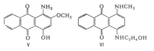 Антрахиноновые красители обеспечивают гамму красных, фиолетовых, синих и бирюзовых цветов, например, розовый Ж (V) и синий К – смесь соединений с основным компонентом формулы VI.