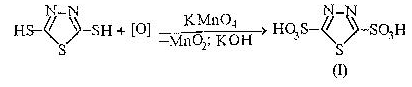 Необходимое соотношение 2,5-димеркапто – 1,3,4-тиадиазола и перманганата калия для полного окисления тиольных групп до сульфогрупп было определено методом кислотно-основного титрования и оказалось равным 1:4. при этом перманганат-ионы восстанавливаются до диоксида марганца.