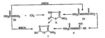 Методы получения производных 2-амино-5-алкилтио – 1,3,4-тиадиазолов (I) основаны на реакции алкилирования щелочных солей 2-амино-5-меркапто – 1,3,4-тиадиазолов, получаемых из 2-амино – 1,3,4-тиадиазолин-5 (4) – тиона (II). Практически этим путем синтезированы почти все известные соединения (I). Отмечено, что N, N’ – дитиокарбамоилгидразин (IV) при алкилировании диалкилсульфатами через алкилтиоэфиры (V) может быть превращен в соединения (I) [11]. Нами установлено, что алкил (аралкил) тиоционаты в среде полифосфорной кислоты при 90–100°С реагируют с тиосемикарбазидом (III) с образованием производных аминотиадиазолов (I).