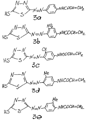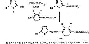 Шесть новых моноазо красителей были получены диазотированием 2-амино-5-меркапто – 1,3,4-тиадиазола 1 , и в последующем азосочетанием с различными N-фенилакриламидами 2а-е . Диазотирование проводили в концентрированных кислотах, так как гидролиз соли диазония происходит в разбавленных кислотах. Использовали концентрированную Н2 SO4 в смеси с ледяной уксусной кислотой, а также нитрозилсерную кислоту (NOHSO4 ). Аминосоединения 1 были успешно диазотированы при 0–5 °С нитрозилсерной кислотой в уксусной кислоте. Конец точки диазотирования определяли на наличие избытка азотной кислоты по йодкрахмальной бумаге. Раствор соли диазония сразу же использовали в реакции азосочетания с N-арилациламидами, так как он при стоянии разлагается даже на холоду. В результате получали хорошие красители 3а-е с выходом 68–85%: