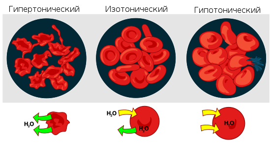 Если же подобный раствор находится в замкнутом пространстве, например, в клетке крови, то осмотическое давление может привести к разрыву клеточной мембраны. Именно по этой причине лекарства, предназначенные для введения в кровь, растворяют в изотоническом растворе, содержащем столько хлорида натрия (поваренной соли), сколько нужно, чтобы уравновесить создаваемое клеточной жидкостью осмотическое давление. Если бы вводимые лекарственные препараты были изготовлены на воде или очень сильно разбавленном (гипотоническом по отношению к цитоплазме) растворе, осмотическое давление, заставляя воду проникать в клетки крови, приводило бы к их разрыву. Если же ввести в кровь слишком концентрированный раствор хлорида натрия (3-5-10 %, гипертонические растворы), то вода из клеток будет выходить наружу, и они сожмутся. В случае растительных клеток происходит отрыв протопласта от клеточной оболочки, что называется плазмолизом. Обратный же процесс, происходящий при помещении сжавшихся клеток в более разбавленный раствор, — соответственно, деплазмолизом.