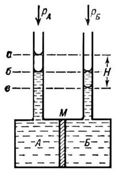 Принципиальная схема осмометра: А — камера для раствора; Б — камера для растворителя; М — мембрана. Уровни жидкости в трубках при осмотическом равновесии: а и б — в условиях равенства внешних давлений в камерах А и Б, когда rА = rБ, при этом Н — столб жидкости, уравновешивающий осмотическое давление; б — в условиях неравенства внешних давлений, когда rА — rБ = p.