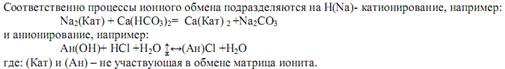 Метод ионного обмена основан на свойстве некоторых твердых тел (ионитов) поглощать из раствора ионы в обмен на эквивалентное количество других ионов того же знака. Иониты подразделяются на катиониты и аниониты. Катиониты содержат подвижные катионы натрия или водорода, а аниониты подвижные ионы гидроксила. В качестве катионитов применяют сульфоугли, алюмосиликаты, искусственные смолы, в качестве анионитов искусственные смолы.