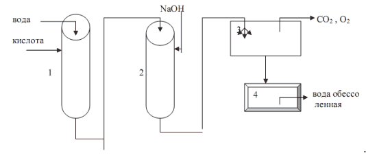 Вода последовательно проходит через катионитный и анионитный фильтры и поступает, распыляясь в дегазатор, где из нее удаляются растворенные диоксид углерода, кислород и другие газы. Для регенерации катионита в фильтр периодически подается кислота или раствор хлорида натрия, для регенерации анионита — раствор щелочи.