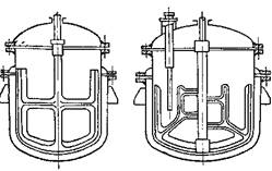 Для перемешивания вязких жидкостей и пастообразных материалов применяют так называемые якорные мешалки с лопастями, изогнутыми по форме стенок и днища сосуда (рис. 4). Якорные мешалки очищают стенки аппарата от налипающего на них материала, благодаря чему улучшается теплообмен и предотвращаются местные перегревы перемешиваемых веществ.