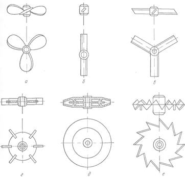 Рис. 6. Быстроходные мешалки: а – пропеллерные; б – двухлопастные; в-трехлопастные; г – открытые турбинные; д – закрытые турбинные; е – фрезерные