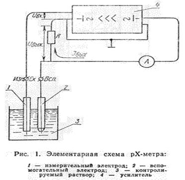 При достаточно большом коэффициенте усиления напряжение Uвых. мало отличается от э.д.с. электродной системы Sx благодаря этому ток, протекающий через электроды в процессе измерения, весьма мал, а ток Iвых. протекающий через сопротивление R, пропорционален э.д.с. электродной системы, т.е. рХ контролируемого раствора.