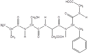 Число и последовательность связанных в пептид аминокислот называют первичной структурой. Для пептида с известной последовательностью формулу записывают, соединяя символы аминокислотных остатков черточками. Наконец, различают собственно пептид, например Ala-Ser-Asp-Phe--Gly и фрагмент -Ala-Ser-Asp-Phe-Gly- (с черточками при концевых аминокислотах). Если часть последовательности пептида еще не известна, то аббревиатуры соответствующих аминокислот, разделенные (запятыми) указывают в скобках: