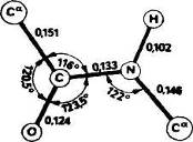 Рис. 2. Средние расстояния между атомами (нм), образующими пептидную связь и углы между связями.