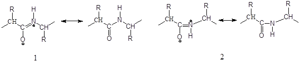 Полинг и Кори в 1951 г. показали с помощью рентгеноструктурного анализа аминокислот, амидов аминокислот и простых линейных пептидов, что пептидная связь С—N укорочена по сравнению с нормальной простой связью (рис. 2).