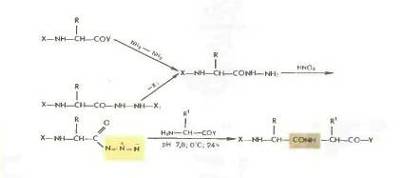 Гидразиды получаются либо прямым гндразинолизом эфиров защищенных аминокислот или пептидов, либо из защищенных гидразидов (—СО— NH — NH— Z—, — СО—NH и т. д.). Перевод в азиды осуществляется обработкой водным раствором нитрита натрия в кислой среде при —5 °С или действием изоамилнитрита или третбутил нитрита при —20 0 С в органическом растворителе (модификация Хонцля и Рудингера 1961). Азиды можно получать и непосредственно из НООС-производных с помощью днфенилфосфорилазида N3 PO(OC2 H5 )z. применяемого в качестве конденсирующего агента (в частности, для получения циклопептидов).
