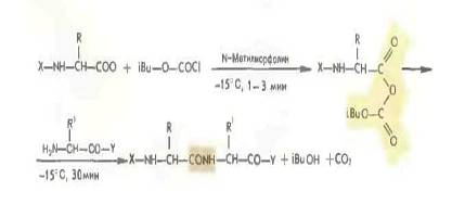 Более распространенным является применение смешанных ангидридов, в частности с производными угольной кислоты, получаемых с помощью изобутилхлоркарбоната (Р. Воган 1951).