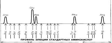 С его помощью можно определить даже один микрограмм аминокислоты, т.е. примерно столько, сколько содержится в одном отпечатке пальца. Количество аминокислоты пропорционально оптической плотности раствора после нагревания с нингидринйм. Если требуется определить еще меньшие количества аминокислоты- порядка нескольких нанограммов, то используют флуорескамин, который реагирует с α-аминогруппой, образуя сильно флуоресцирующее соединение. О природе аминокислоты судят по объему элюции, т.е. по объему буфера, использованному для вымывания данной аминокислоты с колонки (рис. ). Сравнение результатов хроматографии гидролизата со стандартной смесью аминокислот свидетельствует о том, что исследуемый пептид имеет следующий аминокислотный состав: