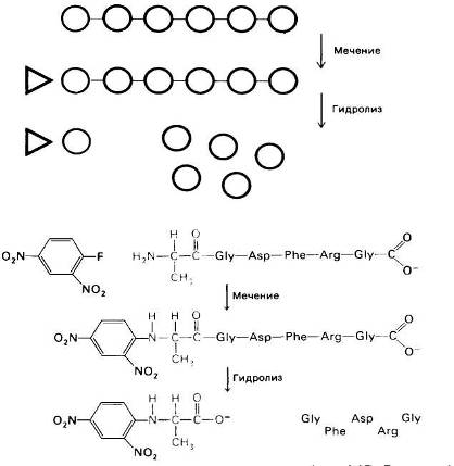 Для определения в белке или пептиде концевого остатка, несущего аминогруппу, его метят с помощью соединения, образующего стабильную ковалентную связь с азотом аминогруппы (рис. 20).