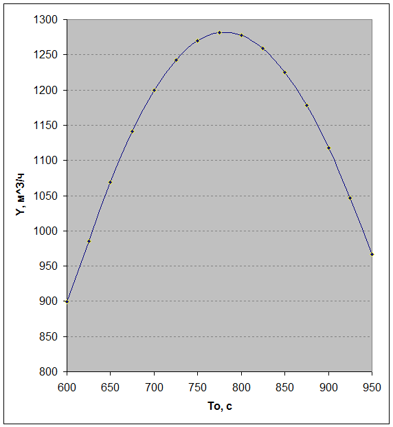 При увеличении температуры газового потока на входе в реактор производительность реактора возрастает практически прямолинейно. Но при достижении температуры, равной 775 (град.) производительность реактора достигает максимального значения и составляет 1281,8 м3/г, после чего с ростом температуры производительность падает.