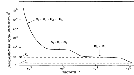 По вкладу в величину поляризации и диэлектрическую проницаемость as > ad > ai >ae. Эти составляющие поляризуемости находят из емкостных, микроволновых и оптических измерений в широком интервале частот (f) (рисунок 1).