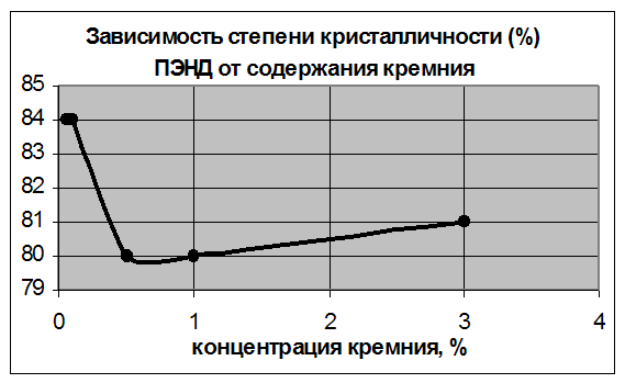 Целью работы являлось изучение структуры и свойств полимеров, модифицированных кремнием. Кремний является дешевым материалом. Кроме того, установлено его уникальное воздействие на воду (происходит активация воды). А активированная кремнием вода оказывает положительное влияние на организм человека, животных[16]. Вот мы и попытались исследовать влияние кремния на структуру и физико-механические свойства материалов. Исследования проводились на полиэтилене низкого давления. Этот материал выбран потому, что он является более технологичным и дешевым, по сравнению с эпоксидными и фенолформальдегидными смолами.