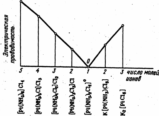 Характер координации хлорид-иона в этих соединениях можно легко установить химическим путем. Так, при взаимодействии растворов [Рt(NН3)6]Сl4 и AgNO3 осаждаются 4 моль AgCl в расчете на 1 моль Pt. Из растворов [Рt(NН3)5С1]С13 и [Рt(NН3)4С12]С12 выделяются соответственно 3 и 2 моль AgCl, а из раствора [Рt(NН3)2С14] хлорид серебра осаждается только в результате долгого стояния раствора при нагревании. В соответствии с характером ионизации меняется и электрическая проводимость растворов. Понятно, что при одинаковой молярной концентрации максимальной электрической проводимостью обладает раствор [Pt(NH3)6]Cl4, минимальной — раствор [Pt(NH3)2Cl4] (рис. 3).