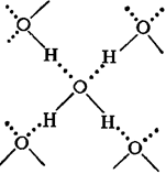 В твердой воде (лед) атом кислорода каждой молекулы участвует в образовании двух водородных связей с соседними молекулами воды согласно схеме, в которой водородные связи показаны пунктиром