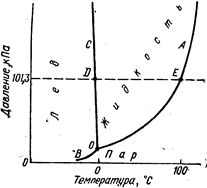 Превращения, происходящие с водой при атмосферном давлении, отражаются на диаграмме точками или отрезками, расположенными на горизонтали, отвечающей 101,3 кПа (760 мм рт. ст.). Так, плавление льда или кристаллизация воды отвечает точке D, кипение воды—точке Е, нагревание или охлаждение воды — отрезку DE и т. п.