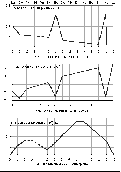 Периодический характер заполнения 4f-орбиталей сначала по одному, а потом по два электрона предопределяет внутреннюю периодичность свойств лантаноидов. Периодически изменяются металлические радиусы, степени окисления, температуры плавления и кипения, величины магнитных моментов, окраска и другие свойства (Рис. 2.1).