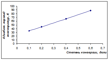 Рис. 3. Зависимость адиабатического перепада температур от степени конверсии