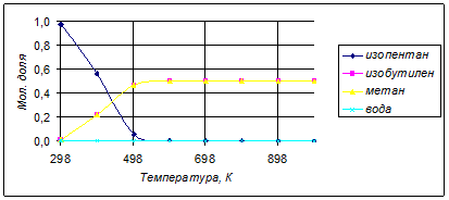 Таким образом, термодинамический анализ показал, что для достижения максимальной степени конверсии реагента процесс пиролиза изопентана проводится при температуре 700-800К, пониженном давлении около 0,5 атм или степени разбавления водой 25-30 моль Н2 О /моль изопентана.