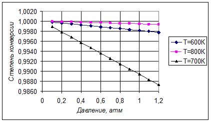 Поскольку процесс идет с повышением числа молей газа, имеет смысл создавать вакуум. Рассчитаем для диапазона давлений 0,1-1,2 атм и интервала температур 600-800К и отсутствии инертных разбавителей равновесную степень конверсии реагента: