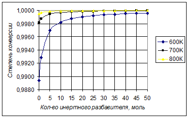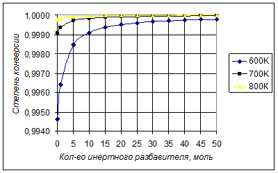 Рассчитаем зависимость равновесной степени конверсии от степени разбавления водой – инертным разбавителем при 800К, 700К, 600К и пониженном давлении 0,5атм. Результаты расчетов приведены в таблице.