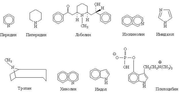 Две обычно используемые системы классифицируют алкалоиды по родам растений, в которых они встречаются, или на основании сходства молекулярной структуры. Классы алкалоидов, члены которых объединены по источнику выделения, – это алкалоиды аконита, аспидоспермы, хинного дерева, спорыньи, эфедры, ибоги, ипекакуаны, люпина, опийного мака, раувольфии, крестовника, картофеля, стрихноса (рвотного ореха) и иохимбе. Химическая классификация основана на особенностях молекулярного азотно-углеродного скелета, общих для членов данной группы алкалоидов. Главные структурные классы включают пиридиновые (никотин), пиперидиновые (лобелин), тропановые (гиосциамин), хинолиновые (хинин), изохинолиновые (морфин), индольные (псилоцибин, активное начало мексиканских галлюциногенных грибов, резерпин и стрихнин), имидазольные (пилокарпин), стероидные (томатидин из томатов), дитерпеноидные (аконитин), пуриновые (кофеин из чая и кофе, теофиллин из чая и теобромин из чая и какао) алкалоиды: