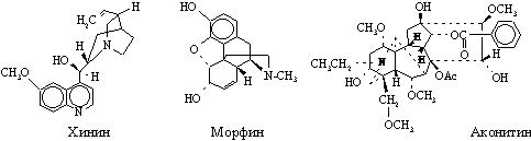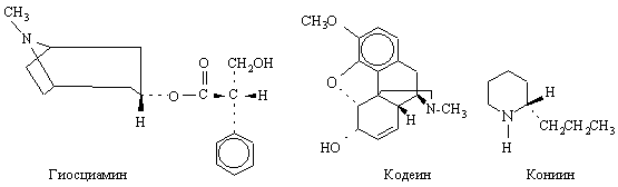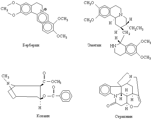 Начало химии алкалоидов обычно относят к 1803, когда Л.-Ш.Деронь выделил из опиума – высохшего на воздухе млечного сока снотворного (опийного) мака Papaver somniferum – смесь алкалоидов, которую он назвал наркотином. Затем в 1805 Ф.Сертюрнер сообщил о выделении морфина из опиума. Он приготовил несколько солей морфина и показал, что именно морфином обусловливается физиологическое действие опиума. Позднее (1810) Б.Гомес обработал спиртовый экстракт коры хинного дерева щелочью и получил кристаллический продукт, который назвал «цинхонино,». П.Пельтье и Ж.Кавенту на фармацевтическом факультете Сорбонны (1820) выделили из «цинхонино» два алкалоида, названные хинином и цинхонином. Позднее исследователи получили более двух десятков оснований из экстрактов коры хинного дерева и растений рода ремиджия (Remijia ) сем. мареновых. Между 1820 и 1850 было выделено и описано большое число алкалоидов новых разнообразных типов. Среди них аконитин из растений рода аконит (Aconitum, борец) – одно из наиболее токсичных веществ растительного происхождения; атропин – оптически неактивная форма гиосциамина и мощное мидриатическое средство (даже 4*10–6г вызывают расширение зрачка); колхицин – алкалоид безвременника осеннего, применяемый при лечении подагры; кониин представляет особый исторический интерес, поскольку именно он стал орудием казни Сократа в 399 до н.э., когда великий философ был вынужден выпить чашу с настоем болиголова (Conium maculatum ); кодеин – близкий к морфину алкалоид, являющийся ценным обезболивающим и противокашлевым средством; пиперин – алкалоид черного перца (Piper nigrum ); берберин – алкалоид из корней барбариса обыкновенного (Berberis vulgaris ); стрихнин – очень ядовитый алкалоид, содержащийся в семенах чилибухи (Strychnos nux-vomica ) и используемый при некоторых сердечных болезнях и для истребления грызунов; эметин содержится в корне ипекакуаны (Cephaelis ipecacuanha, рвотный корень) – рвотное и противопротозойное средство, применяется для лечения амебной дизентерии; кокаин содержится в листьях тропических растений рода Erythroxylum, главным образом в коке (E. coca ), используется в медицине как местноанестезирующее средство: