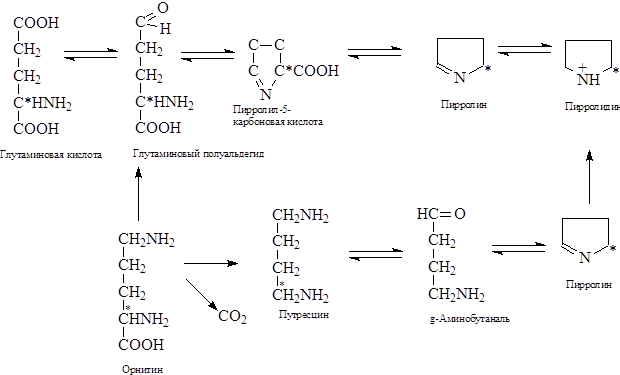 Глутаминовая кислота и орнитин служат источниками образования пирролидина: