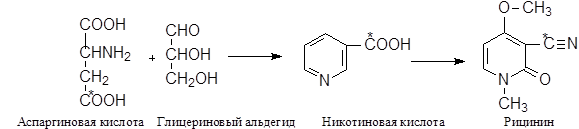Из никотиновой кислоты у клещевины образуется рицинин, а сама никотиновая кисота возникает из аспаргиновой кислоты и глицеринового альдегида: