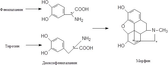 При кормлении мака Papaversomniforum мечеными фенилаланином и тирозином был получен морфин, содержащий изохинолиновое кольцо.