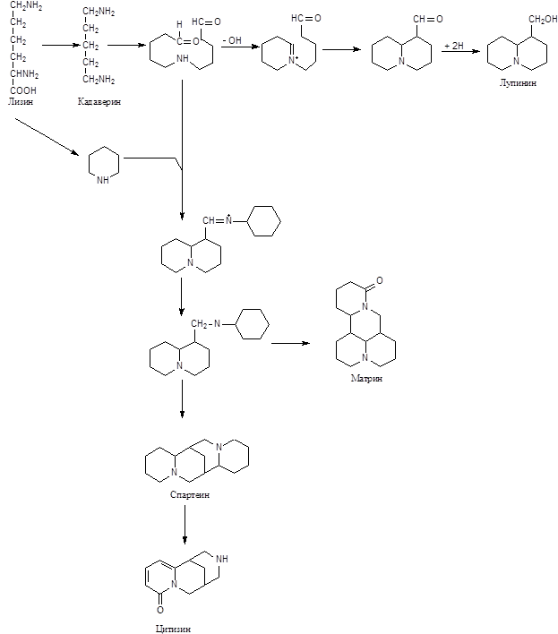 Лизин превращается в амин кадаверин, который является непосредственным предшественником анабазина, лупинина, спартеина и других алкалоидов: