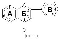 Флавоноидами называется группа фенольных соединений с двумя ароматическими кольцами, объединенных общим структурным составом С6-С3-С6. Первое бензольное кольцо, конденсированное в большинстве классов с кислородосодержащим гетероциклом С или непосредственно прилежащее к карбонильной группе пропанового фрагмента, как в халконах, обозначают буквой А, а боковой фенильный заместитель — буквой В латинского алфавита. Исходя из такого обозначения, порядок нумерации в гетероциклических флавоноидах начинается с гетероатома с переходом на кольцо А, а в кольце В порядок нумерации автономный и начинается с углерода, связанного с остальной частью молекулы [3].