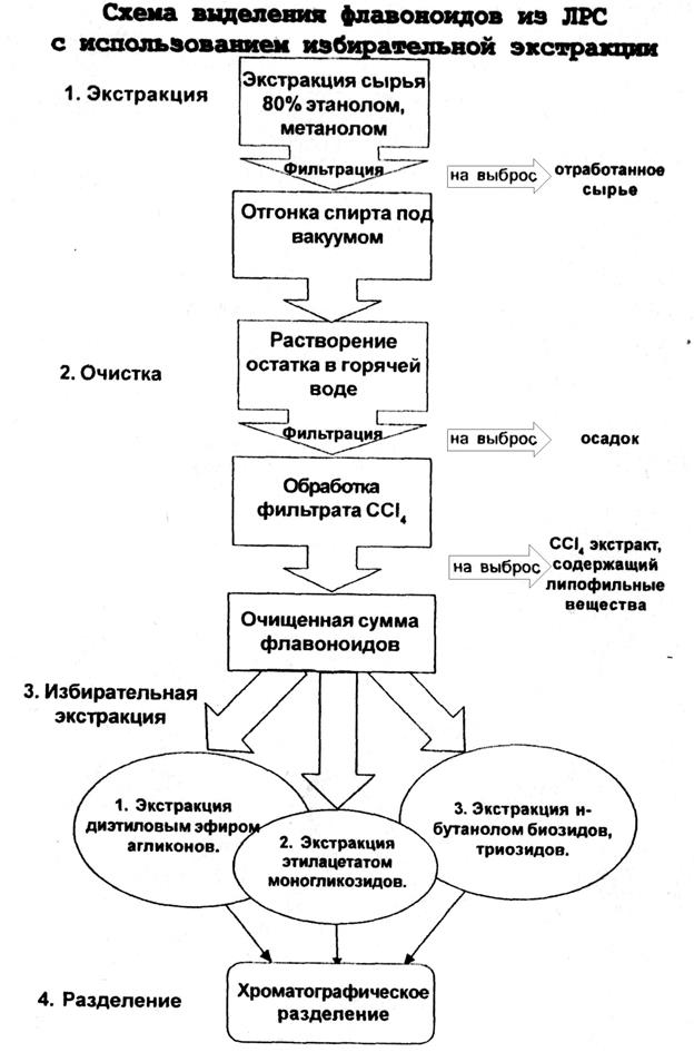 Для выделения флавоноидов из растительного сырья в качестве экстрагента чаще всего используют метиловый или этиловый спирты или их смеси с водой.