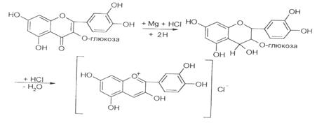 Общей реакцией на флавоноидные соединения является цианидиновая проба, проводимая с помощью концентрированной соляной кислоты и металлического магния. Действие водорода в момент выделения приводит к восстановлению карбонильной группы и образованию ненасыщенного пиранового цикла, который под действием соляной кислоты превращается в оксониевое соединение, имеющее окраску от оранжевой (флавоны) до красно-фиолетовой (флаваноны, флавонолы, флаванонолы).